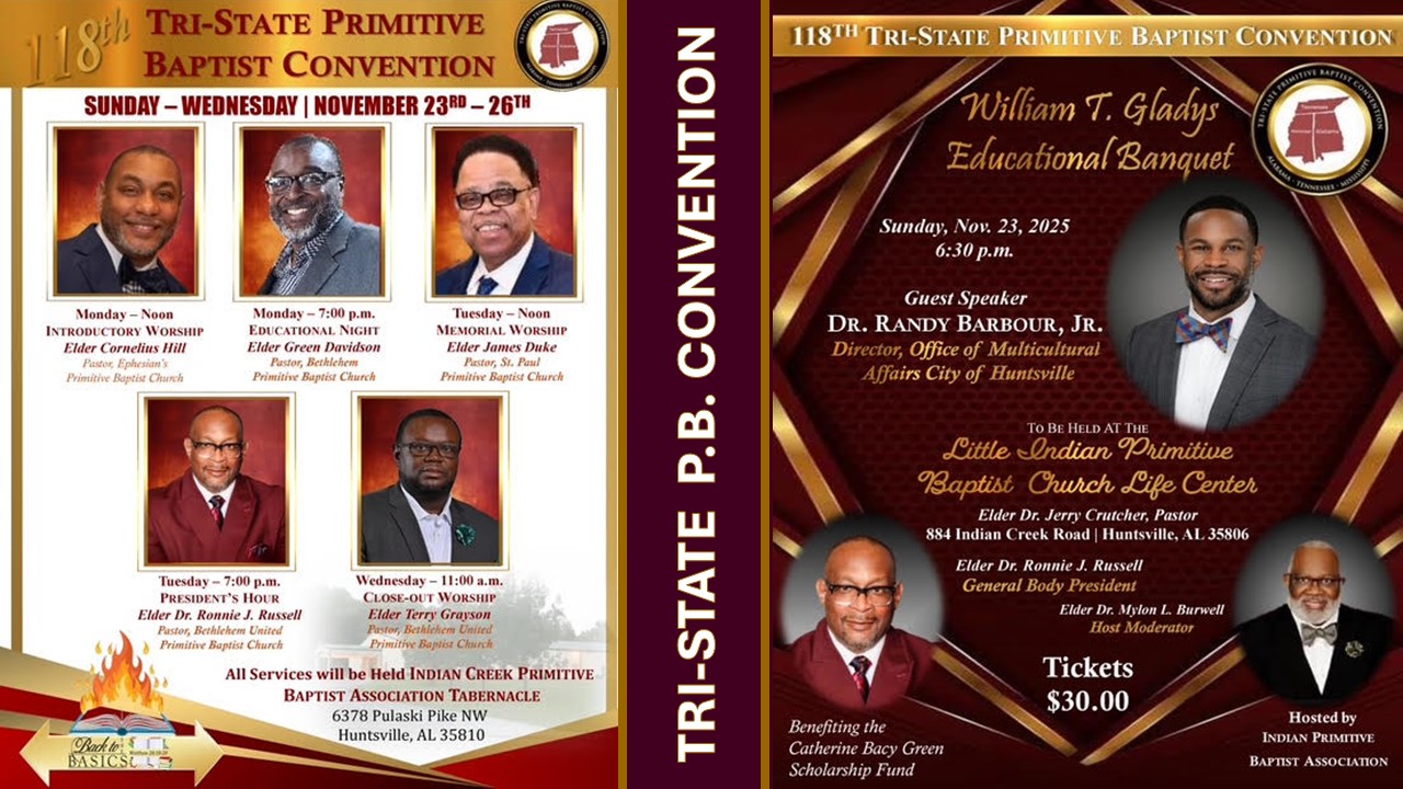 Members are invited to attend the upcoming 118th Tri-State Primitive Baptist Convention that will be held in Huntsville, hosted by the Indian Creek Primitive Baptist Association. All worship services will be held at the Indian Creek P. B. Association Tabernacle located at 6378 Pulaski Pike.