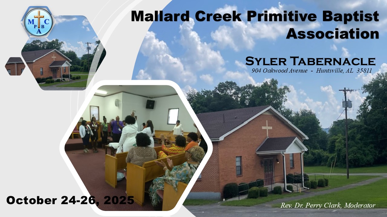 The Mallard Creek P. B. Association will be held October 24-26 at Syler Tabernacle on Oakwood Avenue with registration for the opening session starting 8:30 a.m. Friday morning. Fourth Sunday- Sunday School and Morning Worship will be held at Syler Tabernacle.