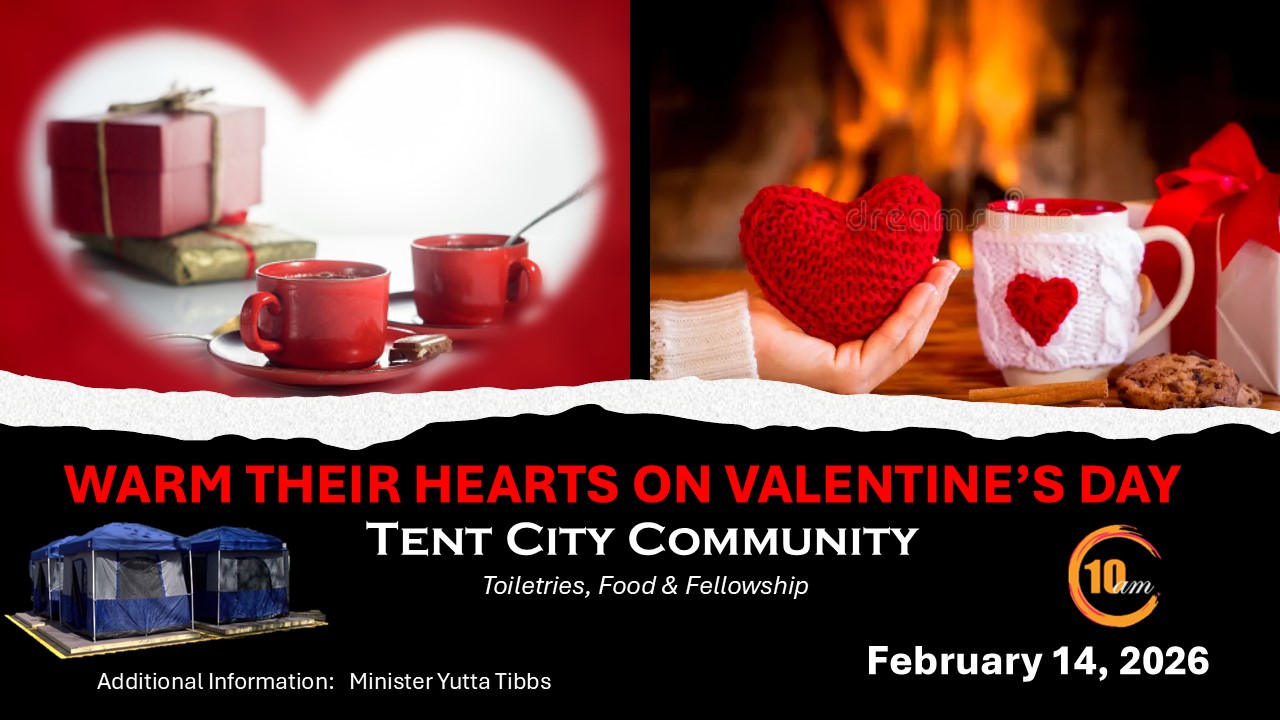 Join us and “Let’s Warm Their Hearts on Valentine’s Day”. Minister Yutta Tibbs and her co-worker, David, invites you to join them as they once again provide food and toiletries for the residents of Tent City on Valentine’s Day at 10:00 a.m. They plan to provide a human connection, with a meal, necessities, and a message of love to so many who may feel alone and forgotten. Our church family is invited to join in on spreading the love. Contact Minister Yutta for additional information.